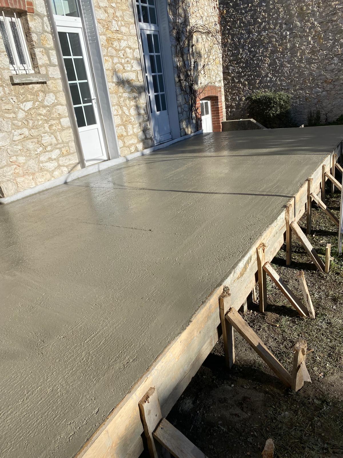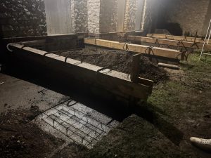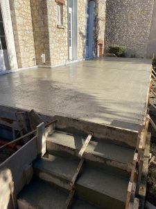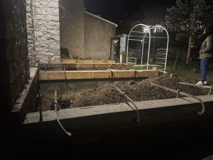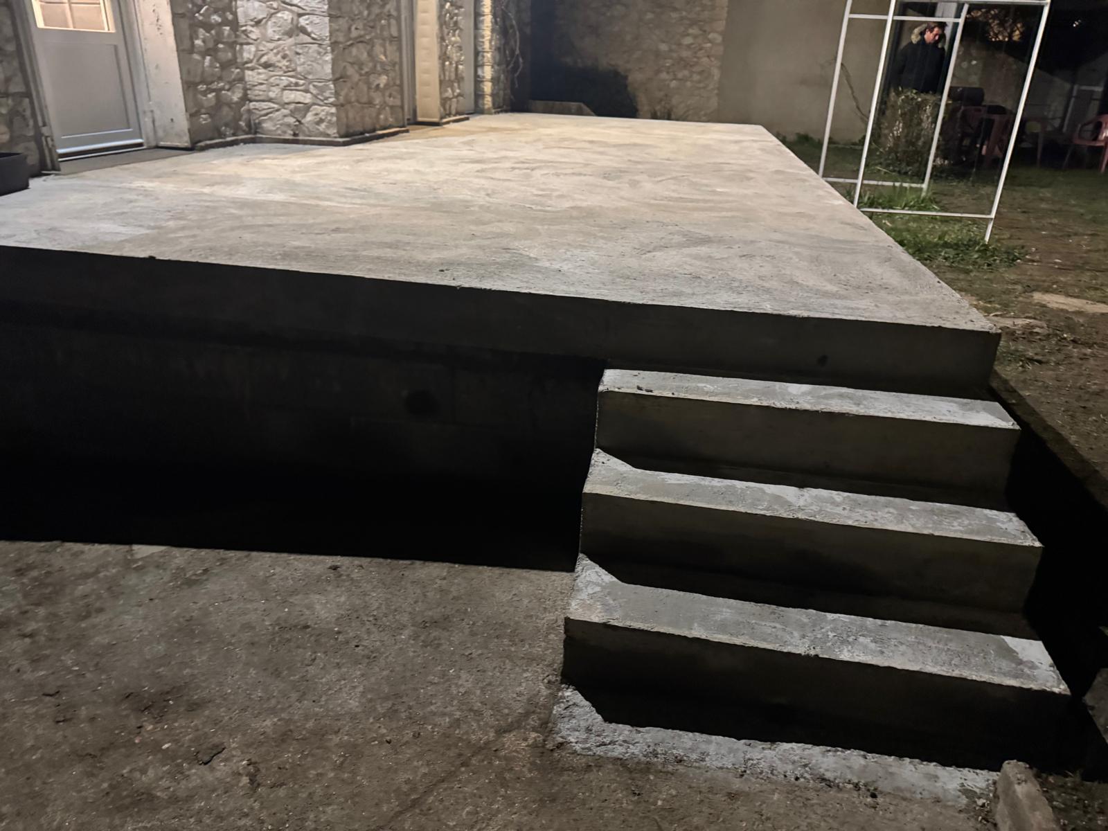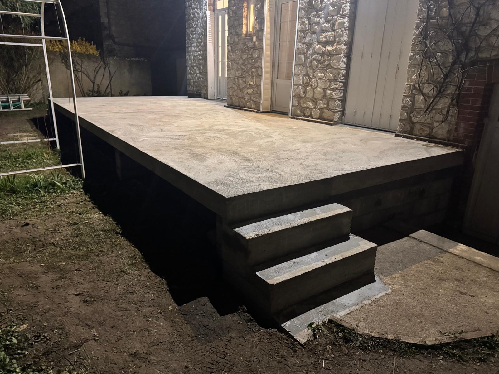 Terrassement, élévation du soubassement en parpaings et coulage d'une dalle en béton armé avec escalier d'accès intégré.